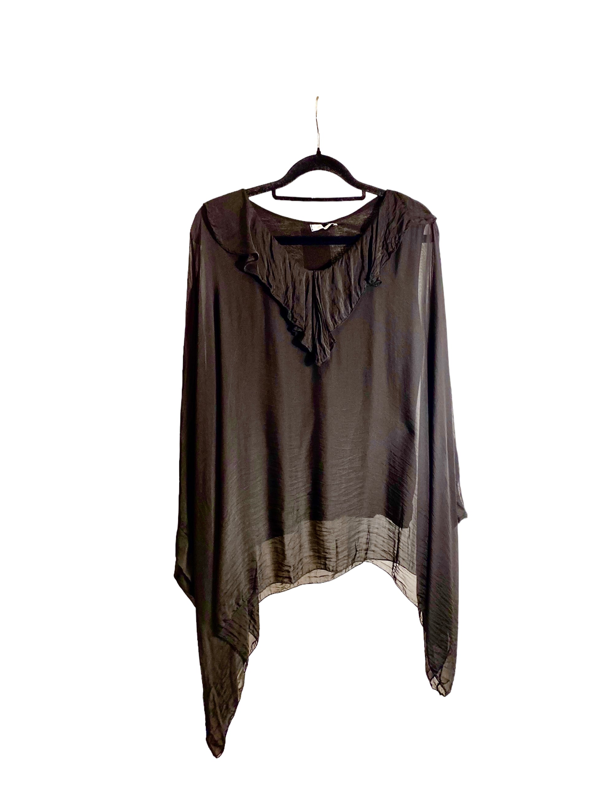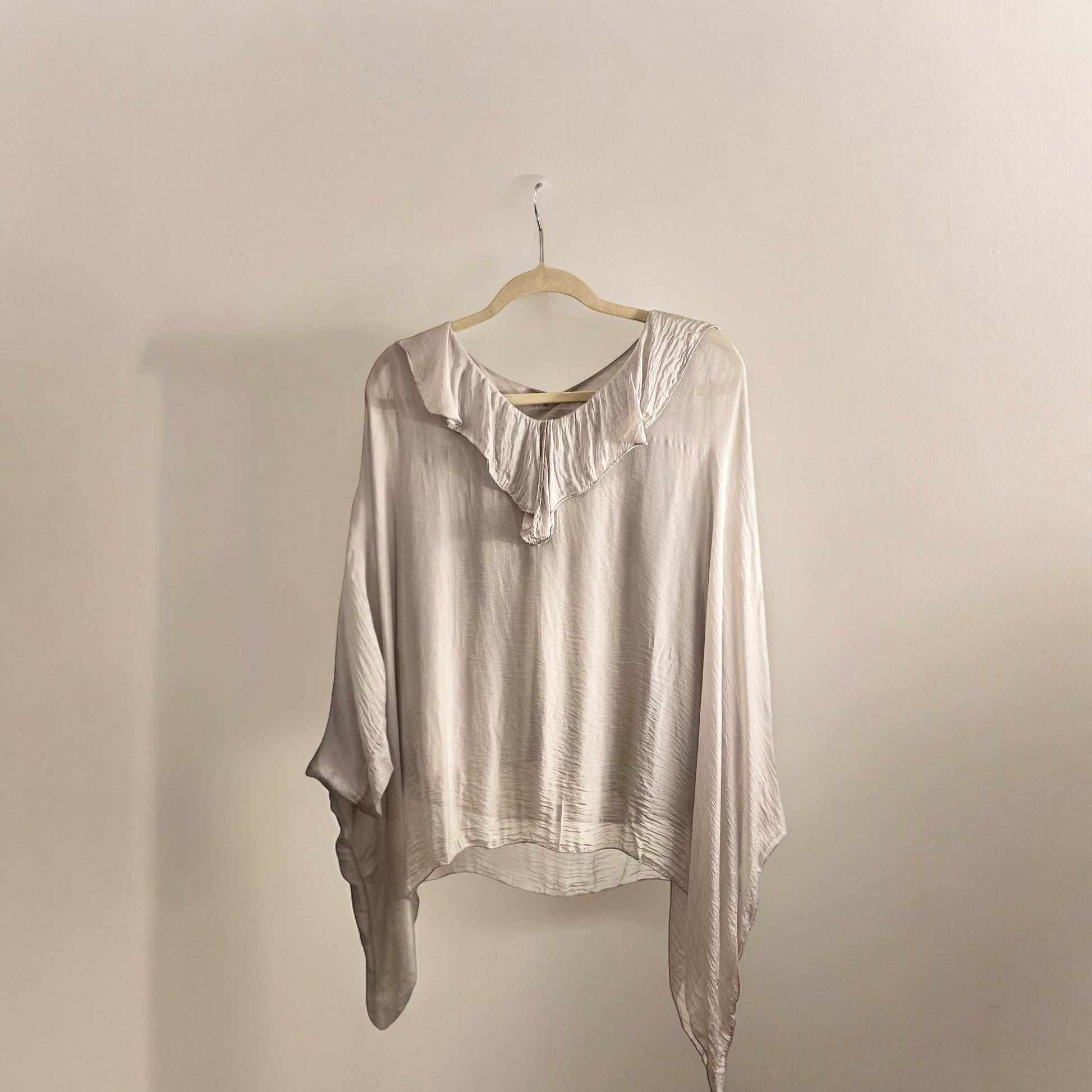 Esta blusa de seda es versátil y elegante, con un corte amplio y cómodo que se adapta a cualquier talla. Hecha de seda y viscosa, es la opción perfecta para añadir un toque de sofisticación a cualquier ocasión. ¡Una prenda imprescindible en tu closet.